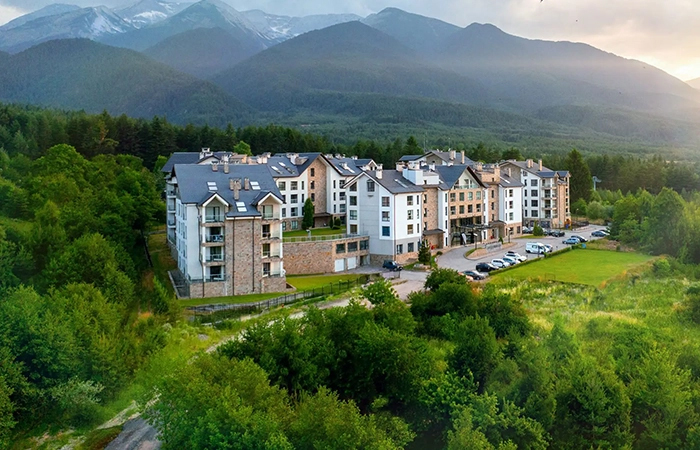 A resort offering both hotel rooms and larger apartments, welcoming pets like dogs and cats. The resort features a spa, wellness center, and is located in a serene mountain setting.